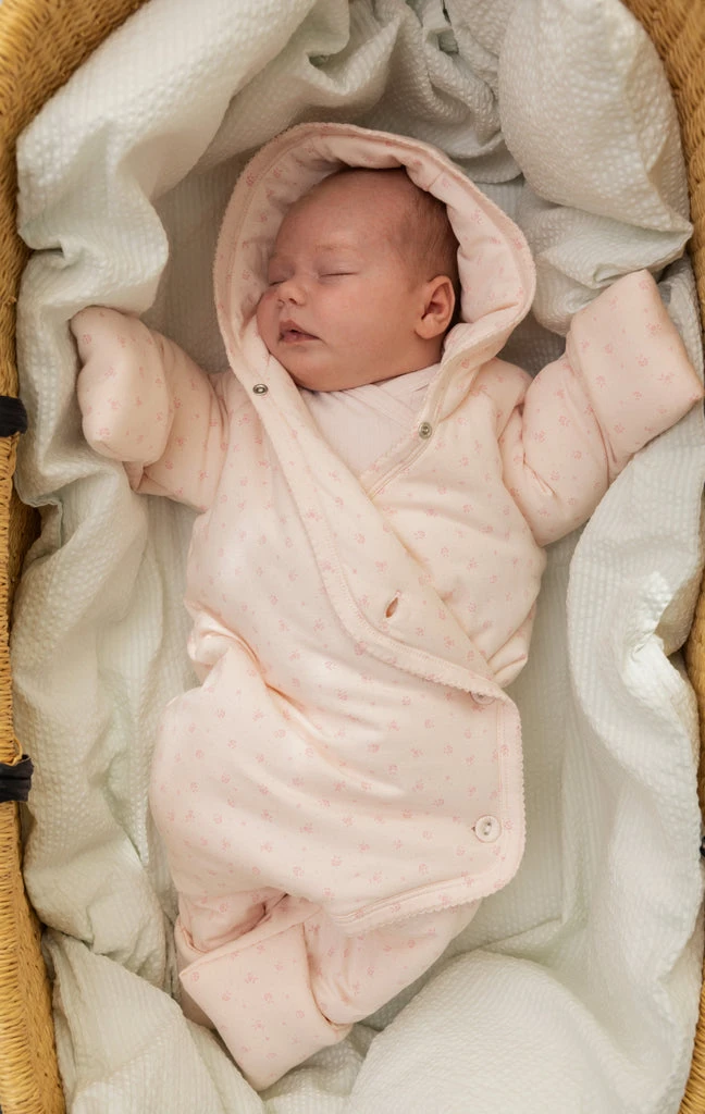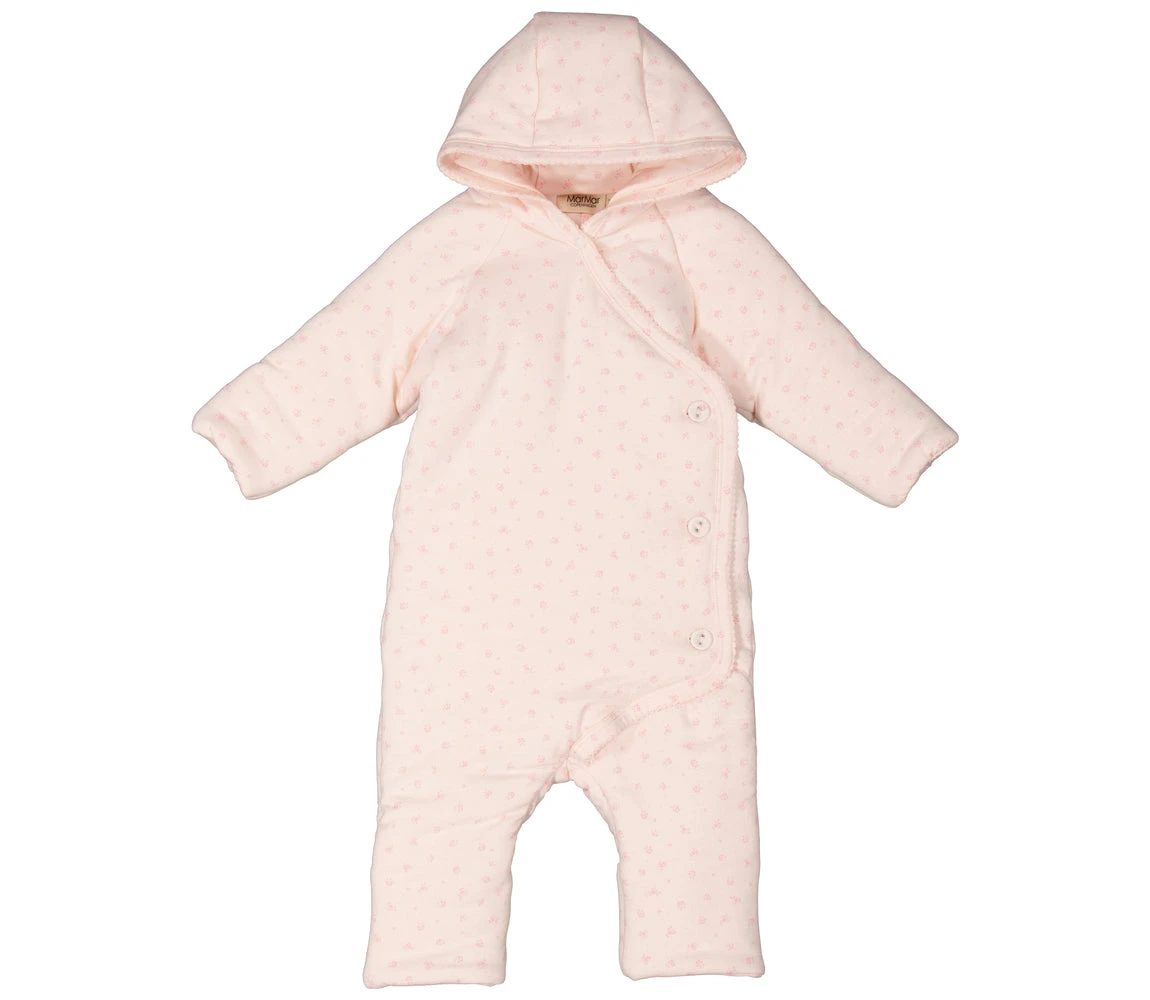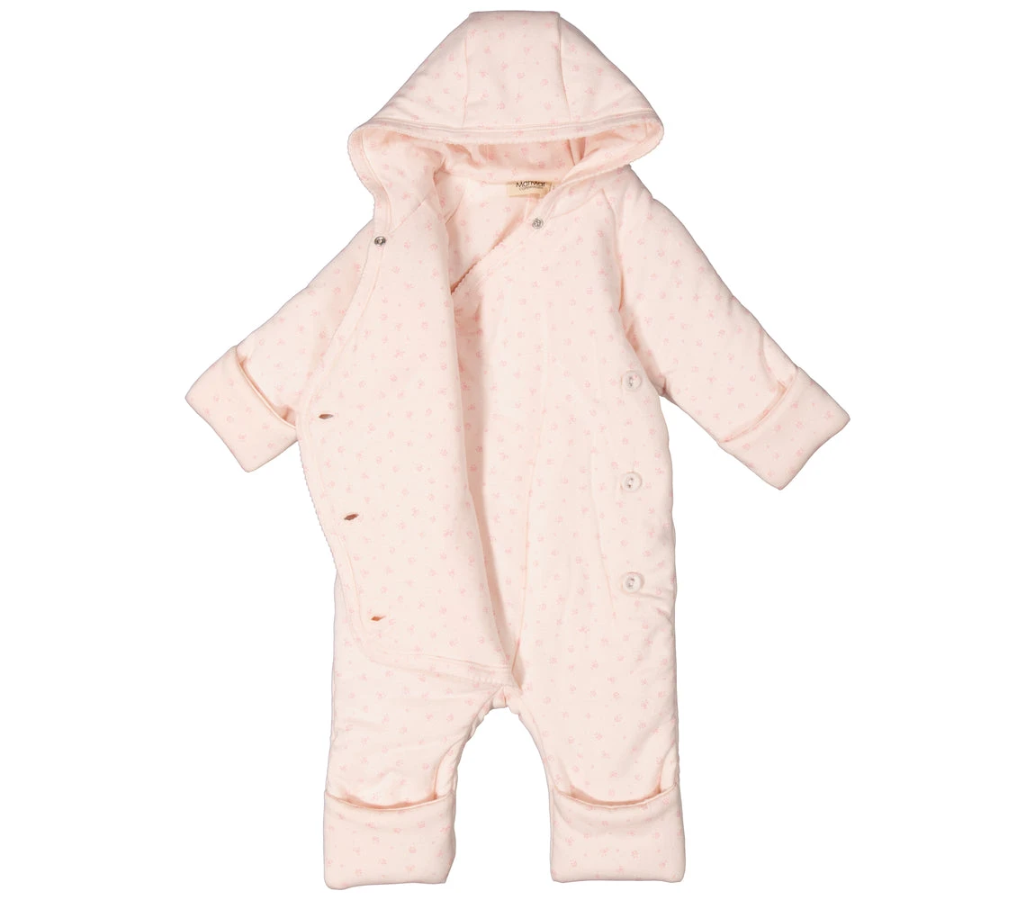Warm padded jumpsuit with a cute floral print and picot edges for newborns with a hood and button closure. The jumpsuit has a smart fold-over option on both hands and feet to keep the little one warm. The jumpsuit is soft, stretchy and comfortable to wear.