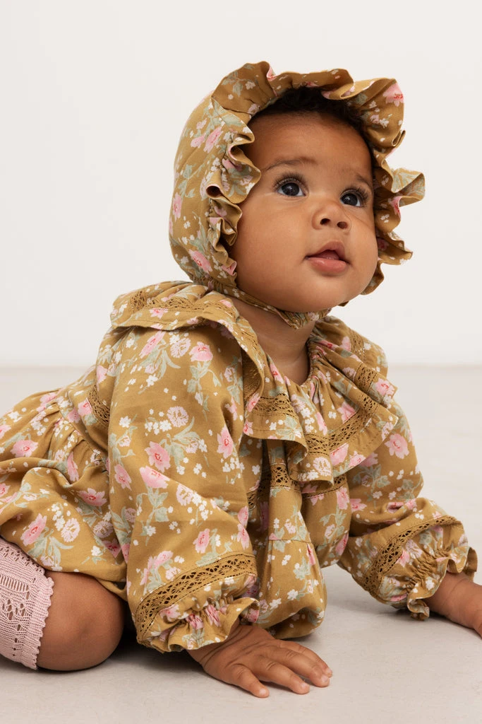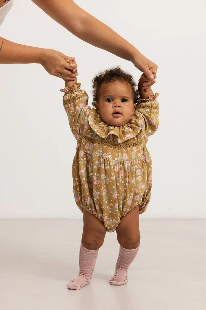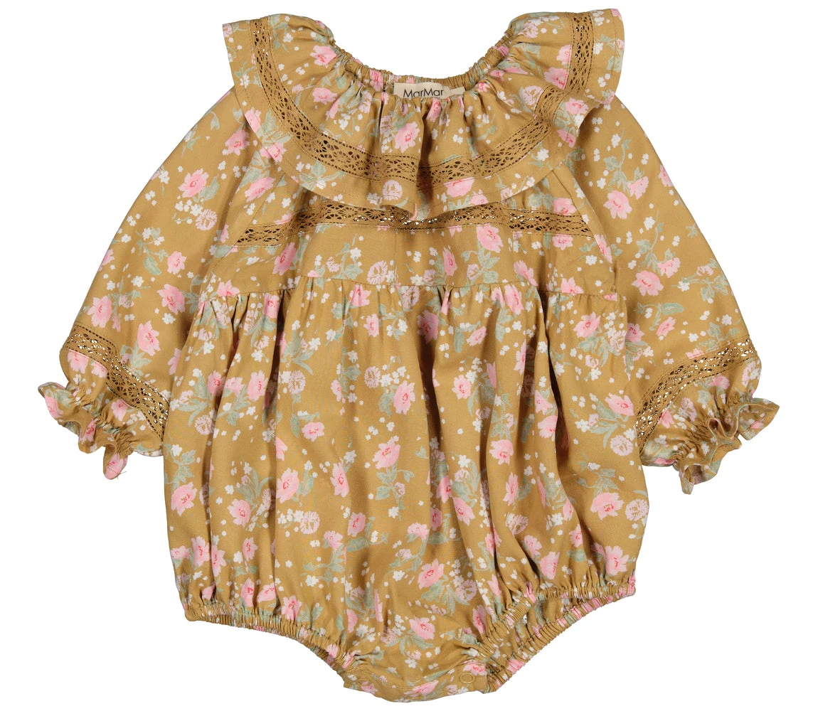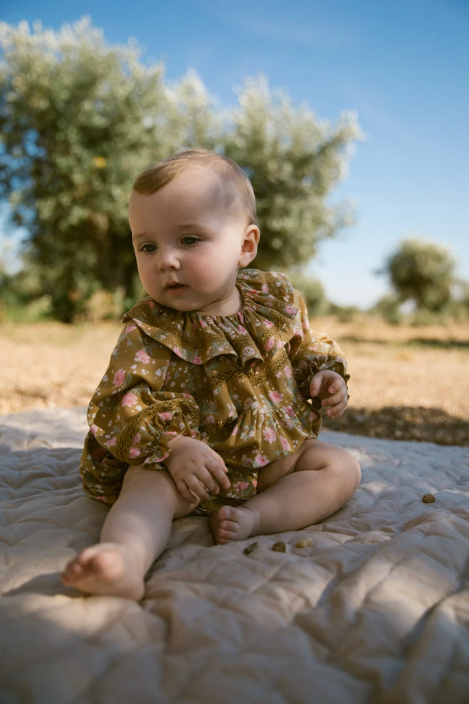 Loose-fitting romper in soft viscose with long sleeves and a pretty collar with lace details. The romper closes with snaps between the legs for easy diaper changes.