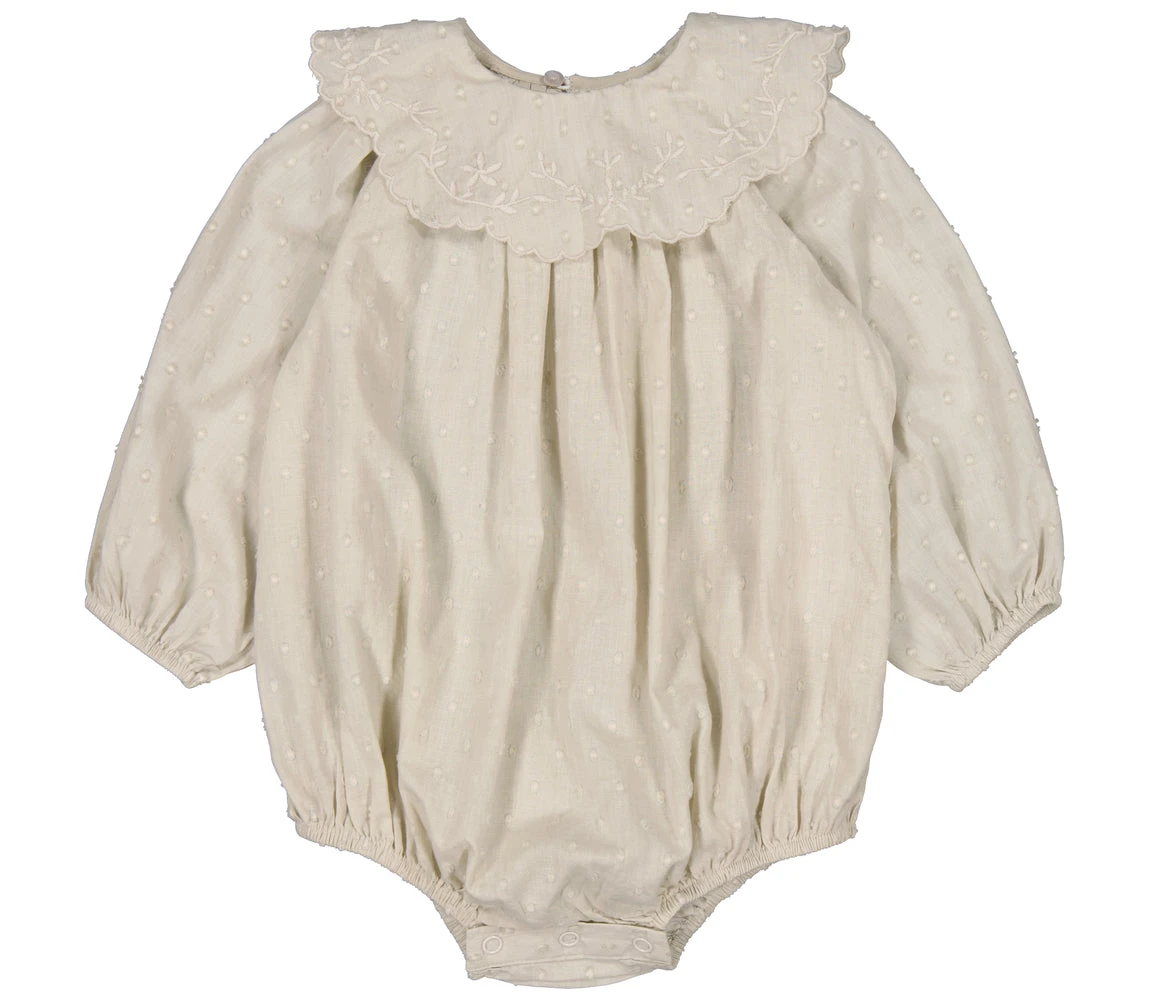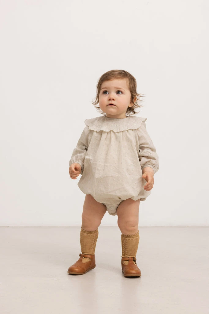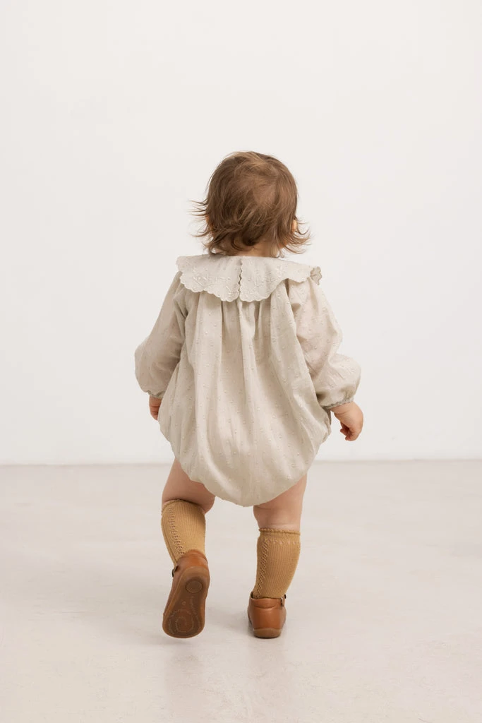 Loose-fitting bodystocking with a nice collar, button closure at the back and a nice embroidery pattern. The bodystocking closes with snaps between the legs for easy diaper changes.