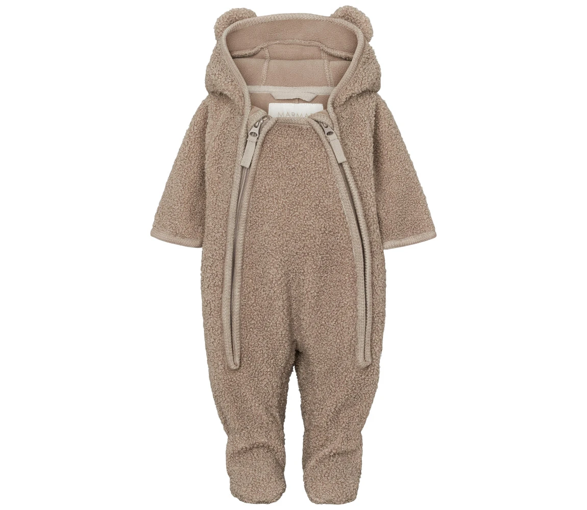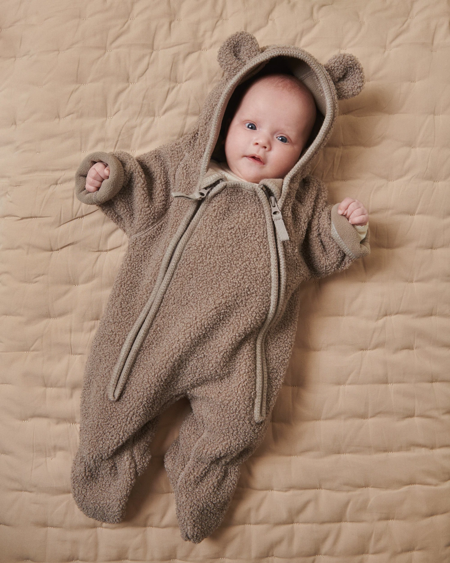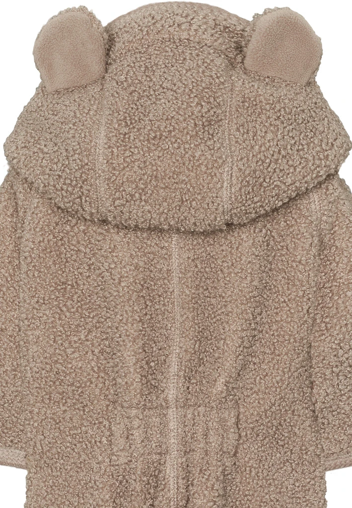 Teddy suit for baby with fleece on the inside and fixed feet. The suit has a zipper closure on both sides and a hood with cute ears.