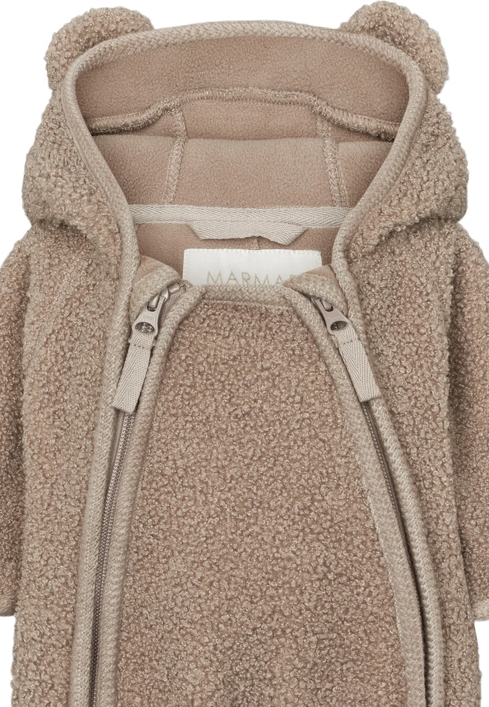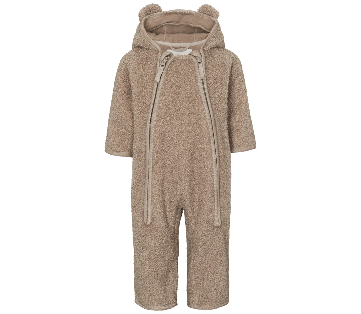 Teddy suit for baby with fleece on the inside and with zipper closure on both sides and a hood with cute ears
