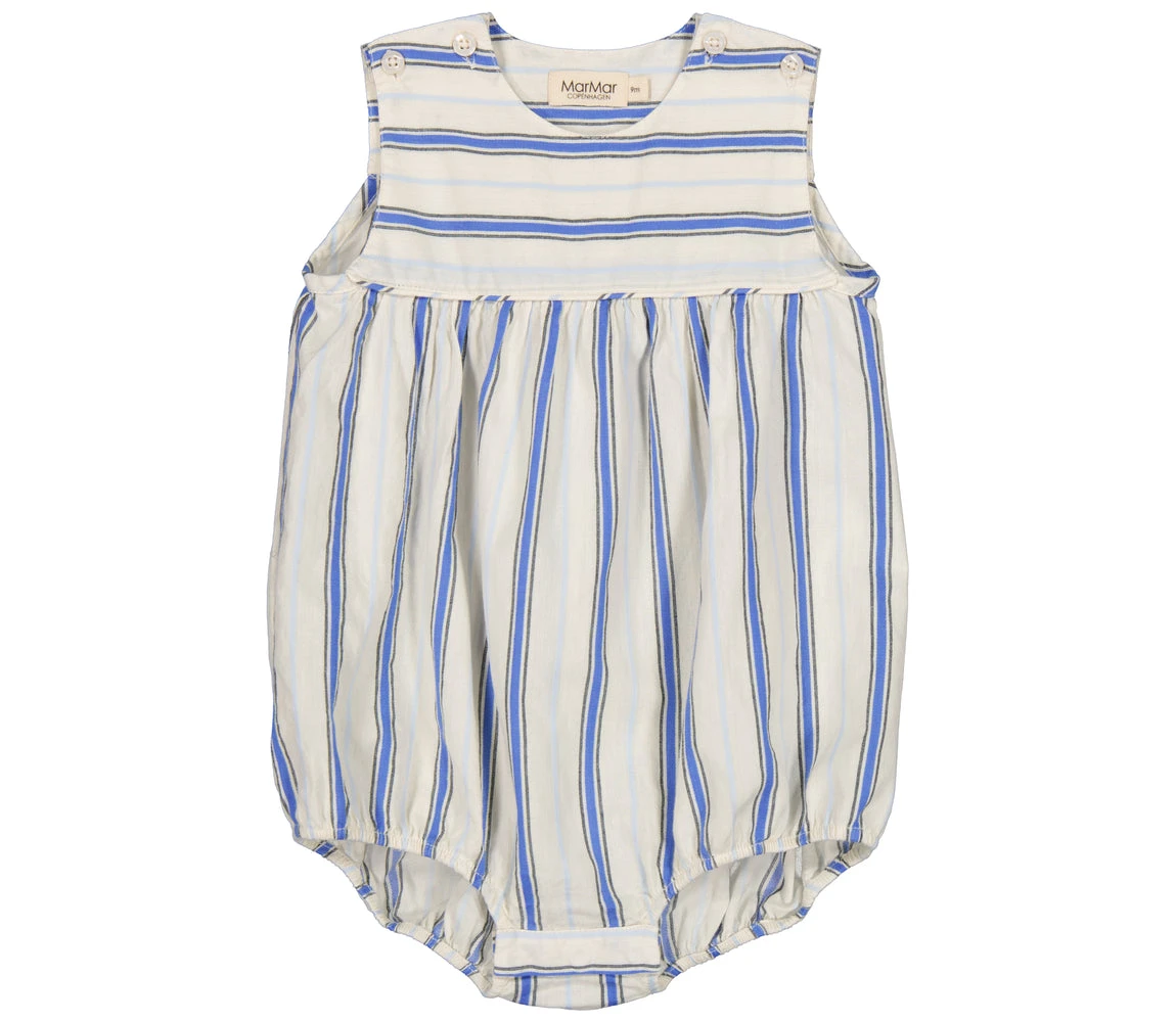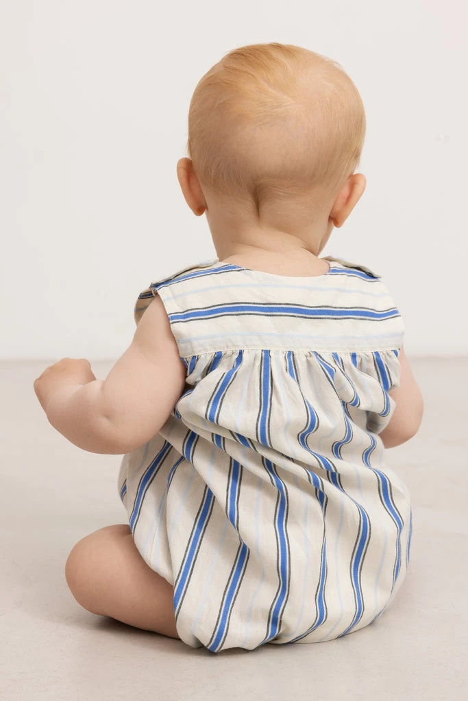 Loose-fitting romper with short sleeves and fine stripes. The romper closes with buttons at the shoulders and between the legs for easy diaper changes.