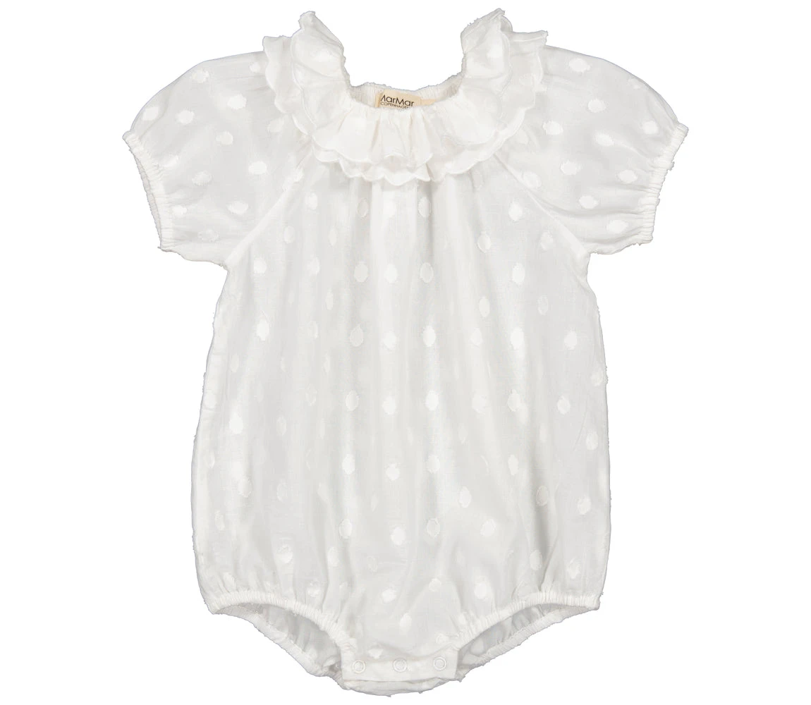Loose-fitting romper with short sleeves and a nice ruffle collar. The romper closes between the legs for easy diaper changes