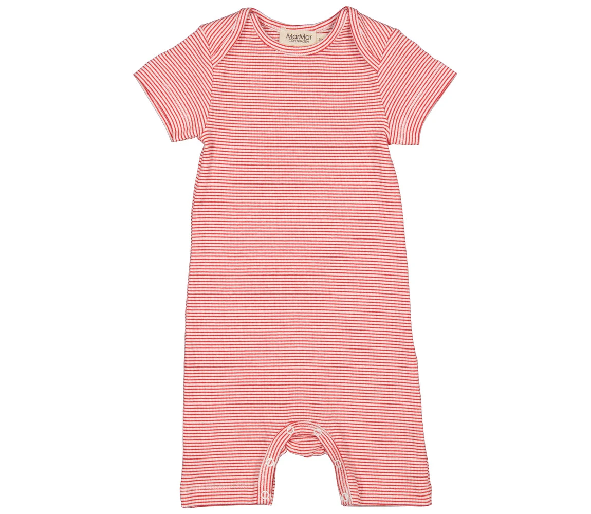 Short-sleeved romper with fine stripes, short legs and a smart neck opening without buttons that can be easily pulled down the body. The romper closes with snaps between the legs for easy diaper changes. The romper is both soft, stretchy and comfortable to wear