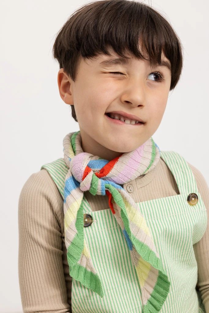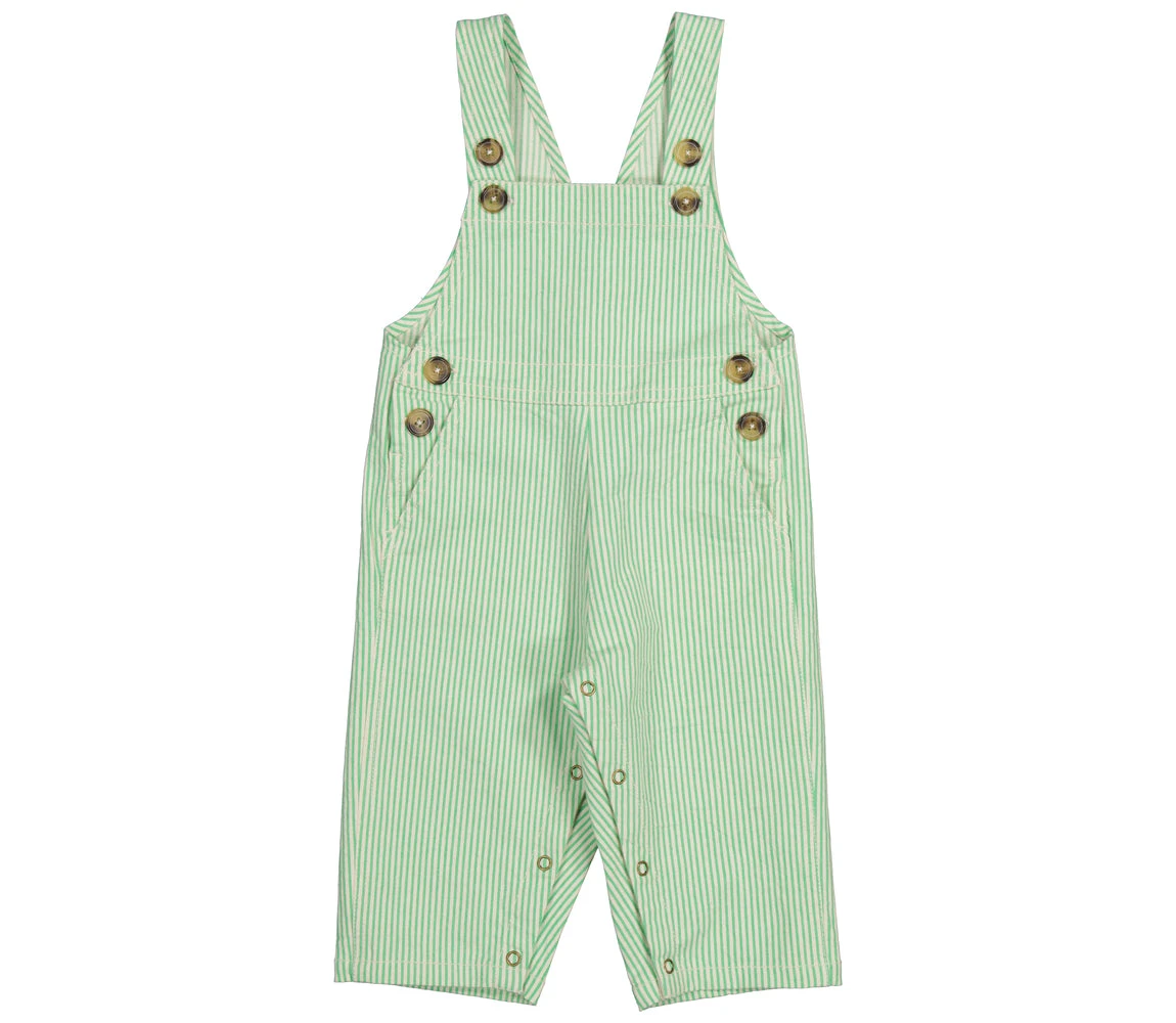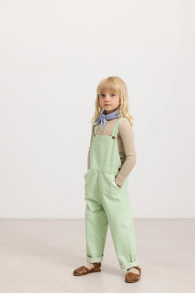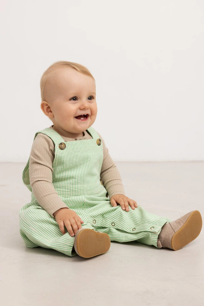 Wide-leg overalls, two side pockets and one back pocket. The suspenders can be closed in two lengths and are closed with snaps between the legs for easy diaper changes. There is a snap closure between the legs up to and including size 92.