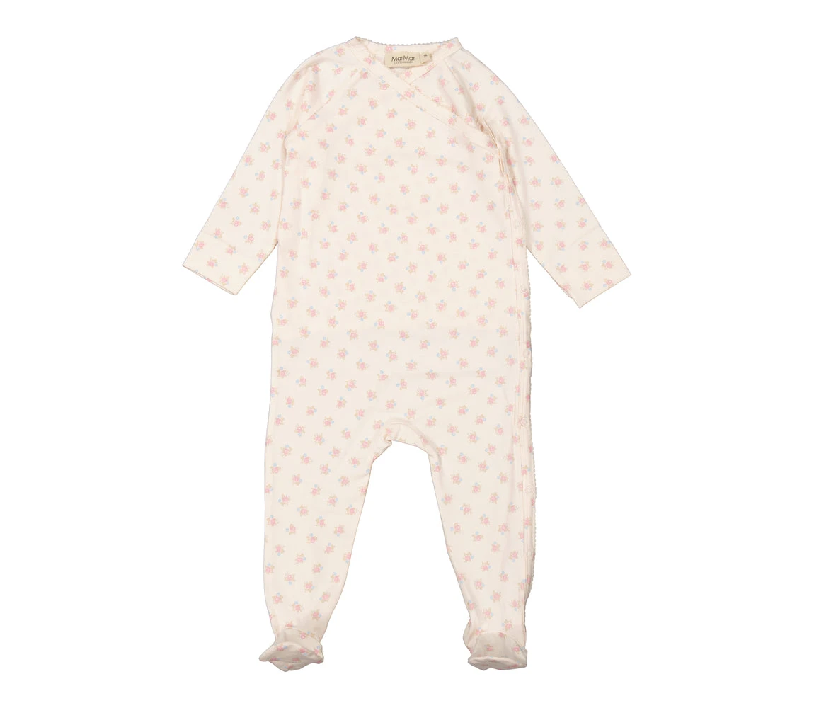 Jumpsuit with feet for newborns. The jumpsuit can be unbuttoned all the way from the neck down both legs with snaps and ties for easy diaper changes. The jumpsuit is soft, stretchy and comfortable to wear.