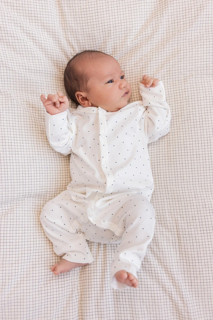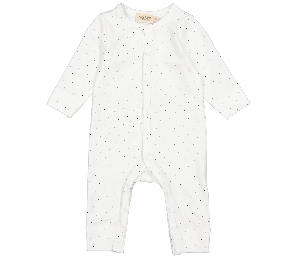 Jumpsuit with a nice print for newborns. The jumpsuit can be unbuttoned all the way from the neck and down both legs with snaps for easy diaper changes. The jumpsuit is soft, stretchy and comfortable to wear.