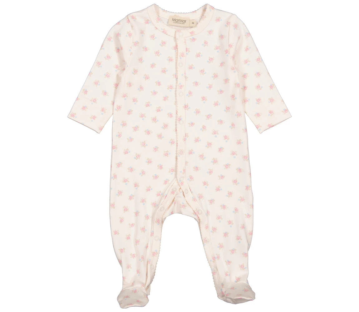 Onesie with feet and a nice print for newborns. The suit can be buttoned all the way up from the neck and down both legs with snaps for easy diaper changes. The onesie is soft, stretchy and comfortable to wear.