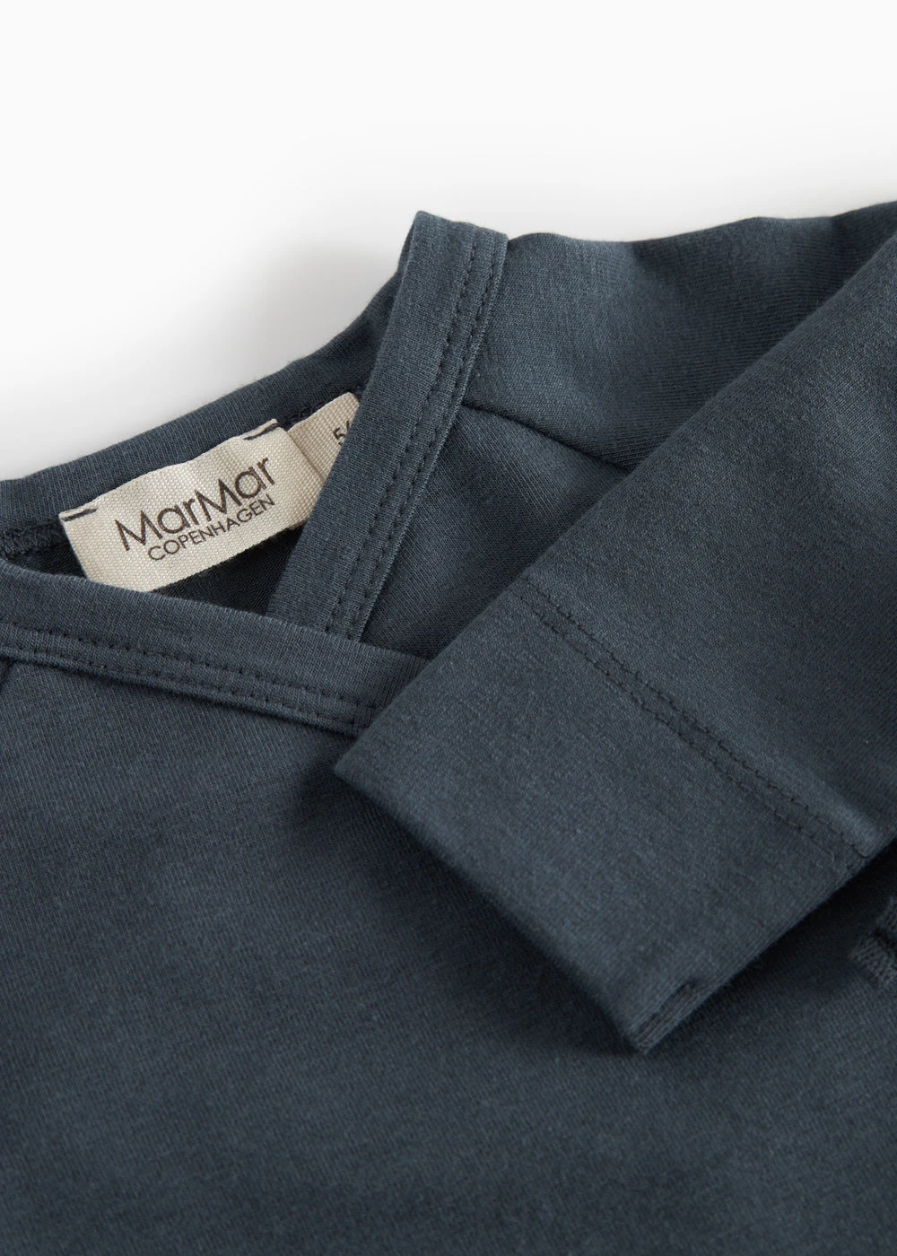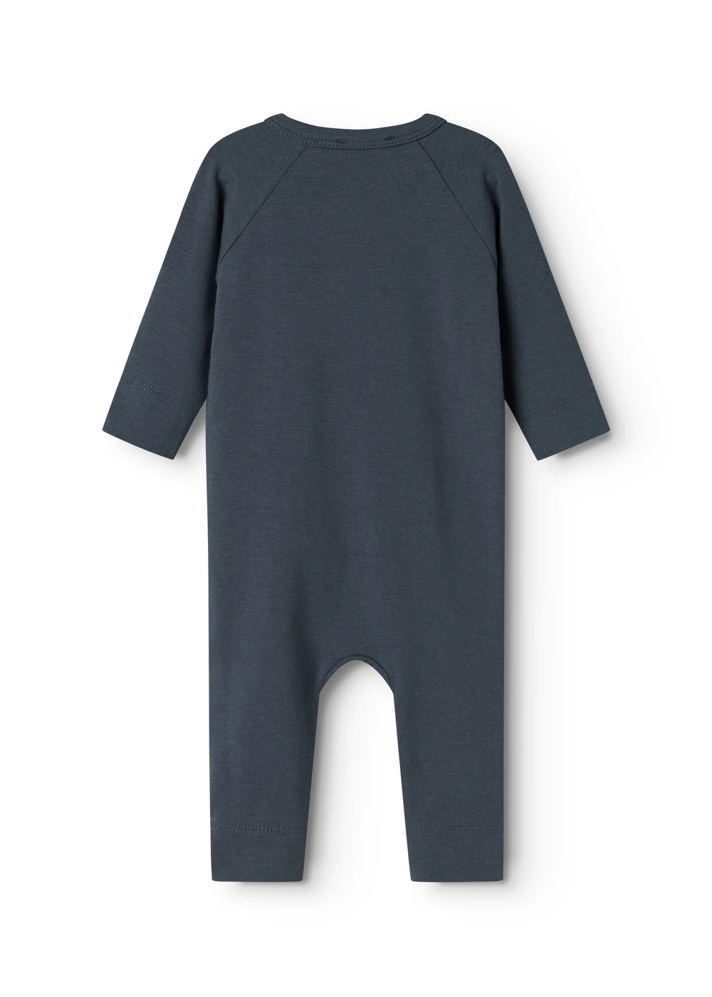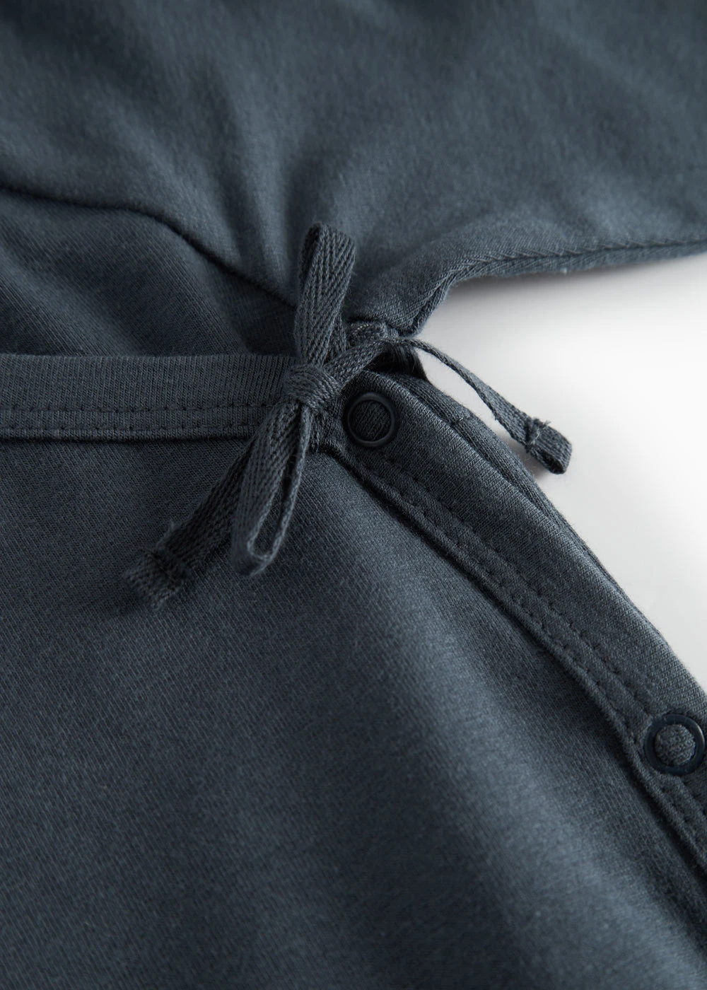 Long-sleeved jumpsuit with wrap-around closure, the jumpsuit closes with snaps and ties from the neck down one leg.
