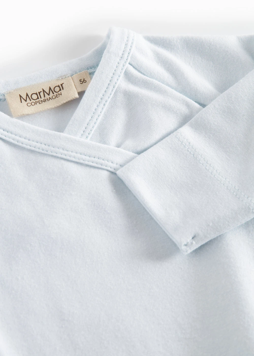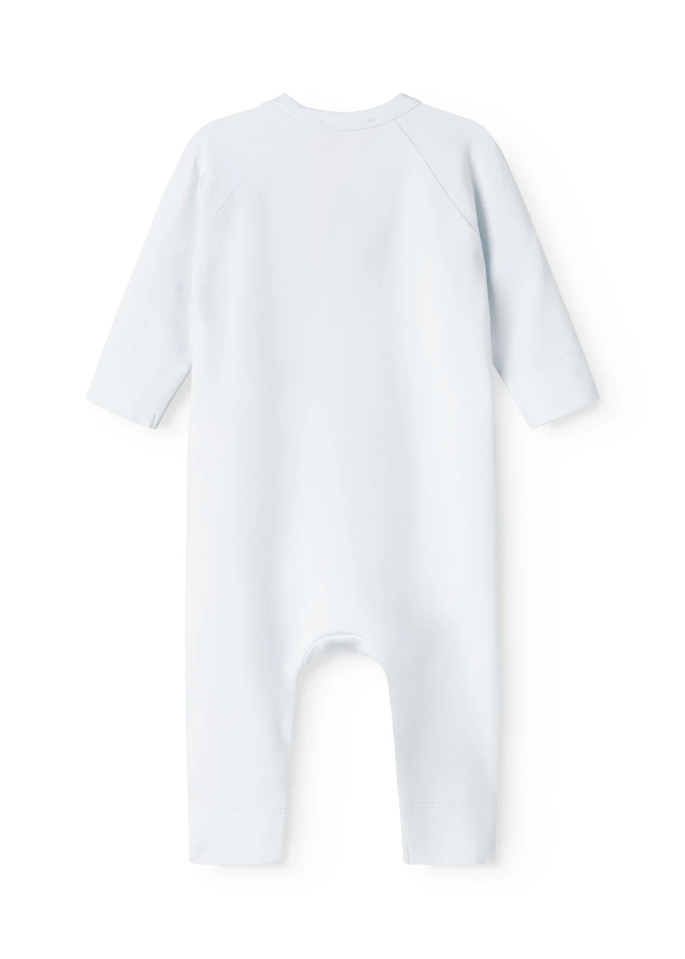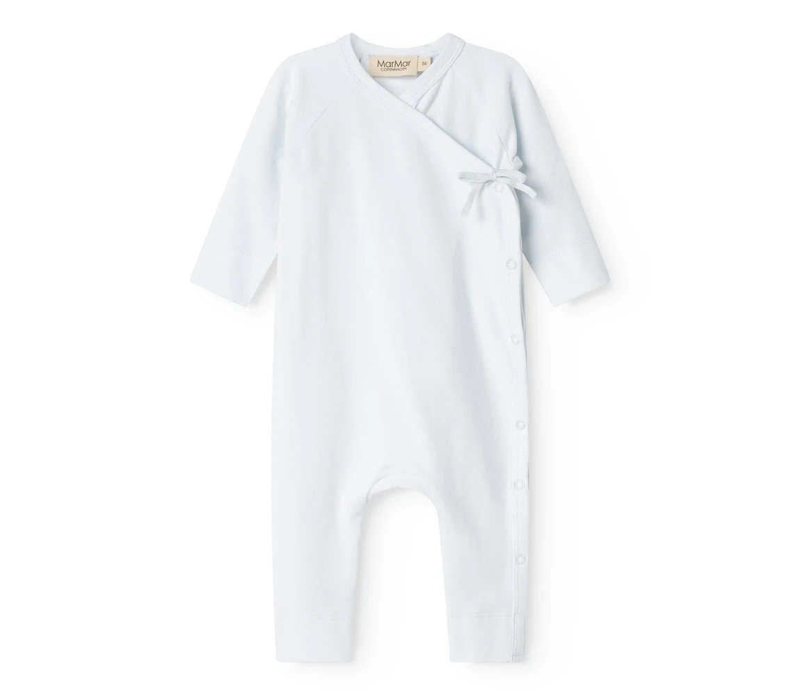 Long-sleeved jumpsuit with wrap-around closure, the jumpsuit closes with snaps and ties from the neck down one leg.