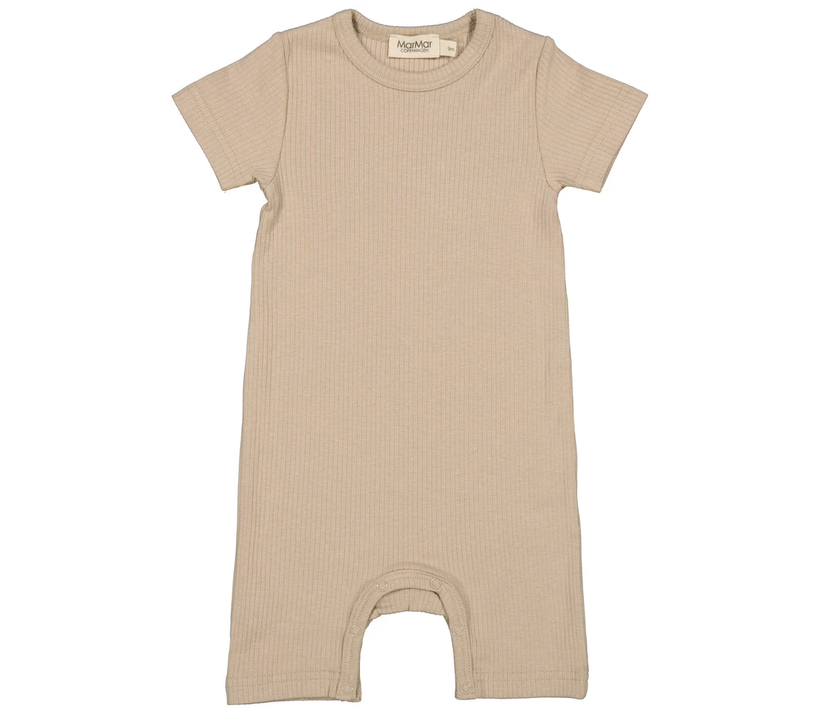 Short-sleeved baby modal romper with short legs that closes with snaps between the legs for easy diaper changes. The romper is ribbed, soft, holds its shape and color and has elastane in it which makes it stretchy and comfortable to wear.