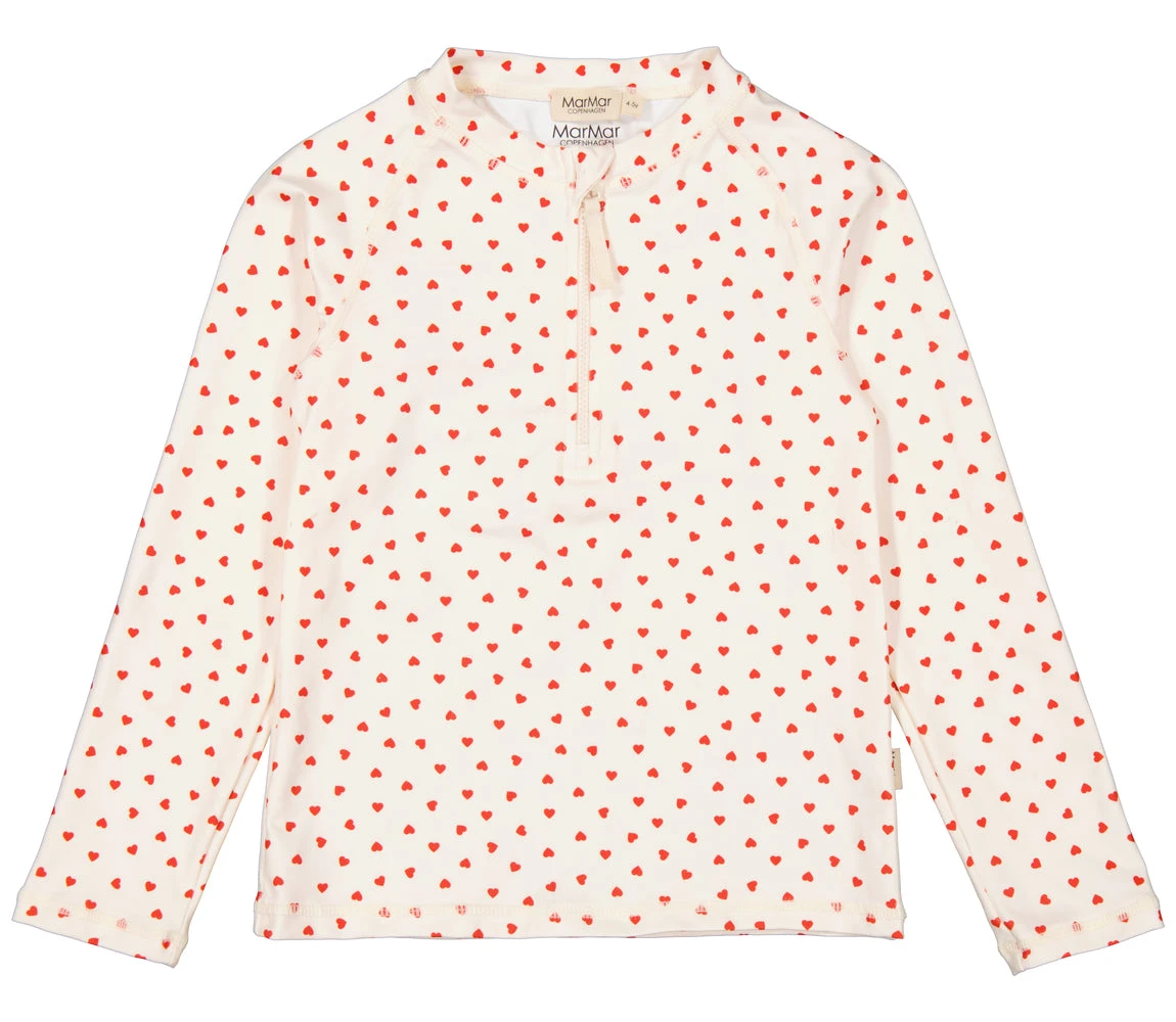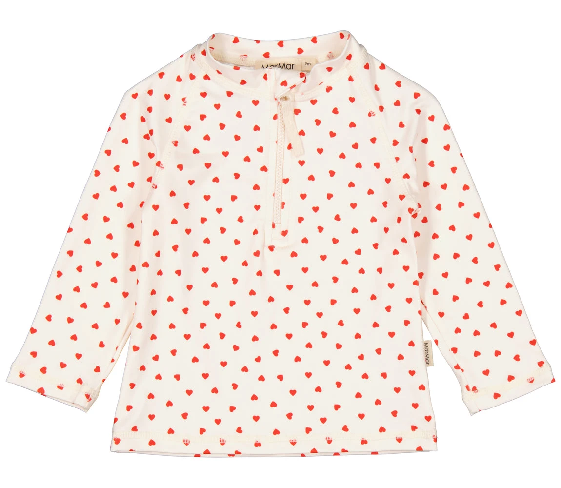Swimsuit with long sleeves and a zipper closure at the front. The swimsuit has a nice heart print.