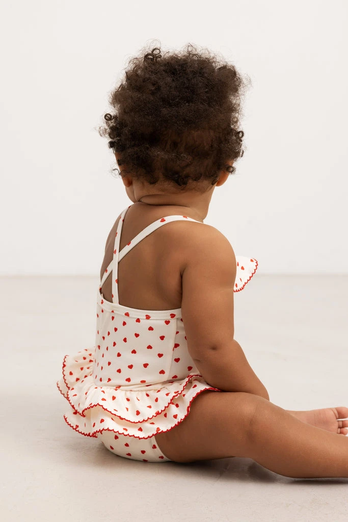 Swimsuit with fine ruffle details, heart print, picot edges and a crossed back