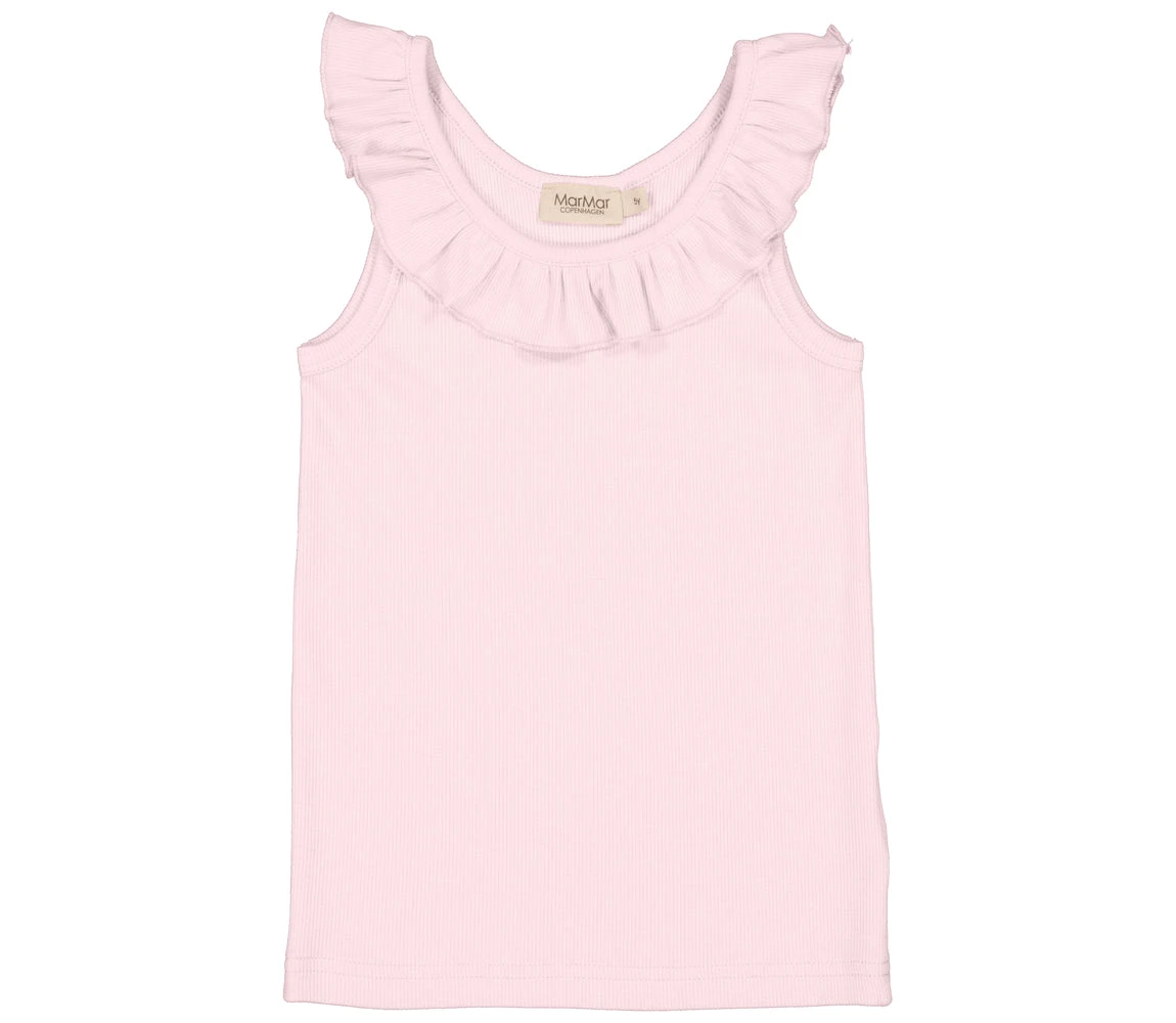 Sleeveless summer top with a cute ruffle. The top is soft, stretchy and comfortable to wear.