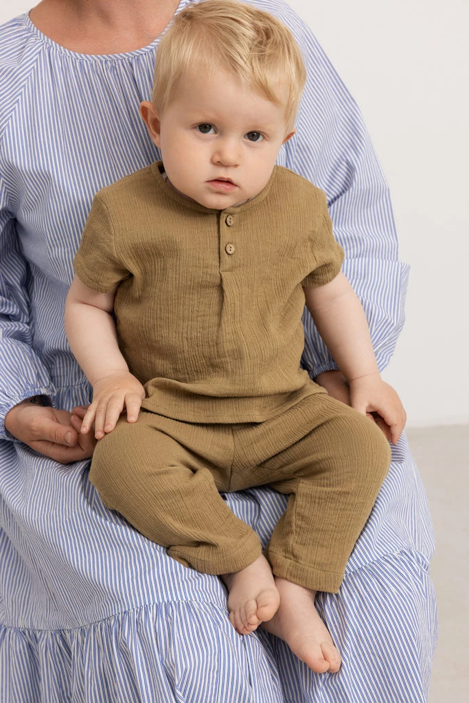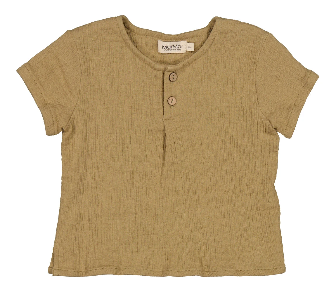 Short-sleeved t-shirt with placket button closure at the front. The t-shirt is made of soft crepe cotton that makes it comfortable to wear.
