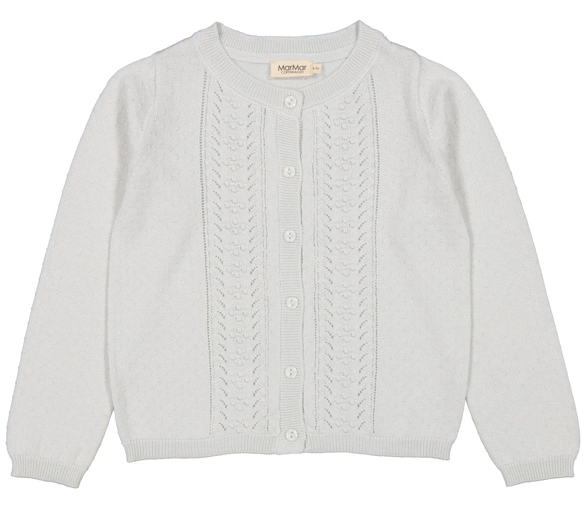 Knit cardigan with button closure at the front. The cardigan has fine pointelle/lace details.