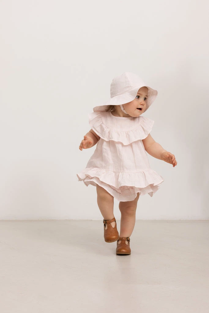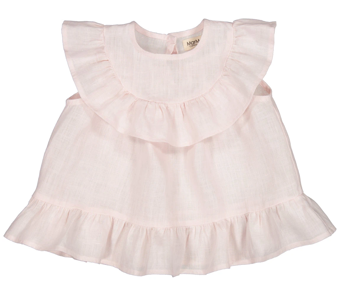 Summer top in linen with a loose fit and wavy ruffle details. The top has a button closure at the back.