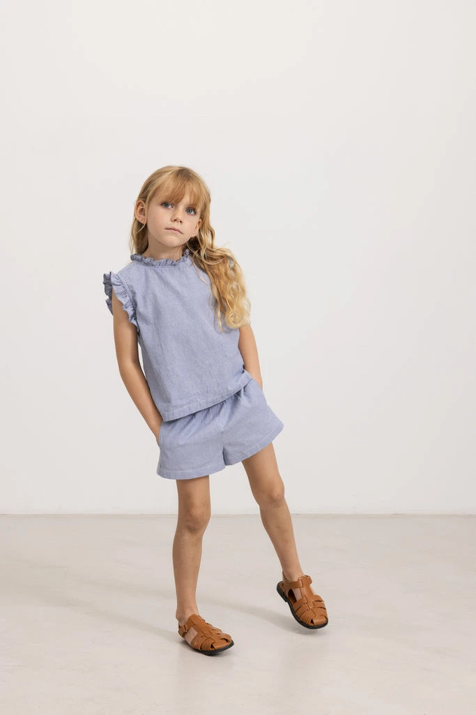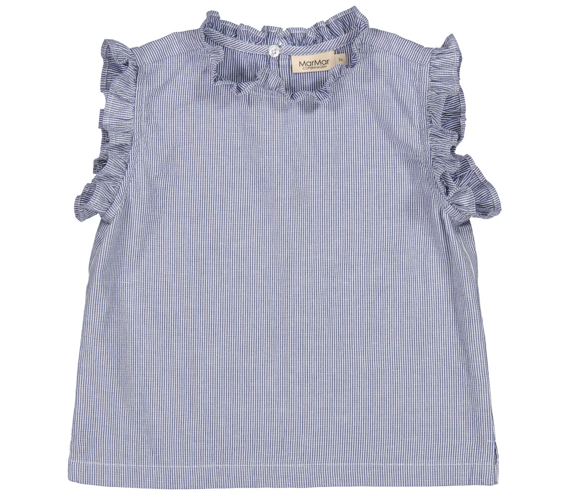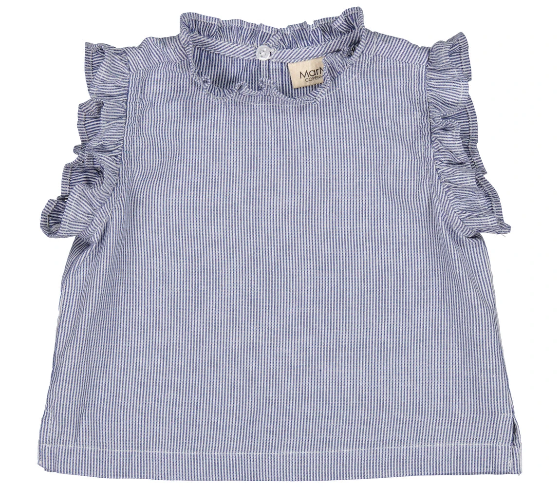 Summer top with woven stripes and wavy ruffle details. The top has a button closure at the back and the top is made of a soft and light cotton quality.