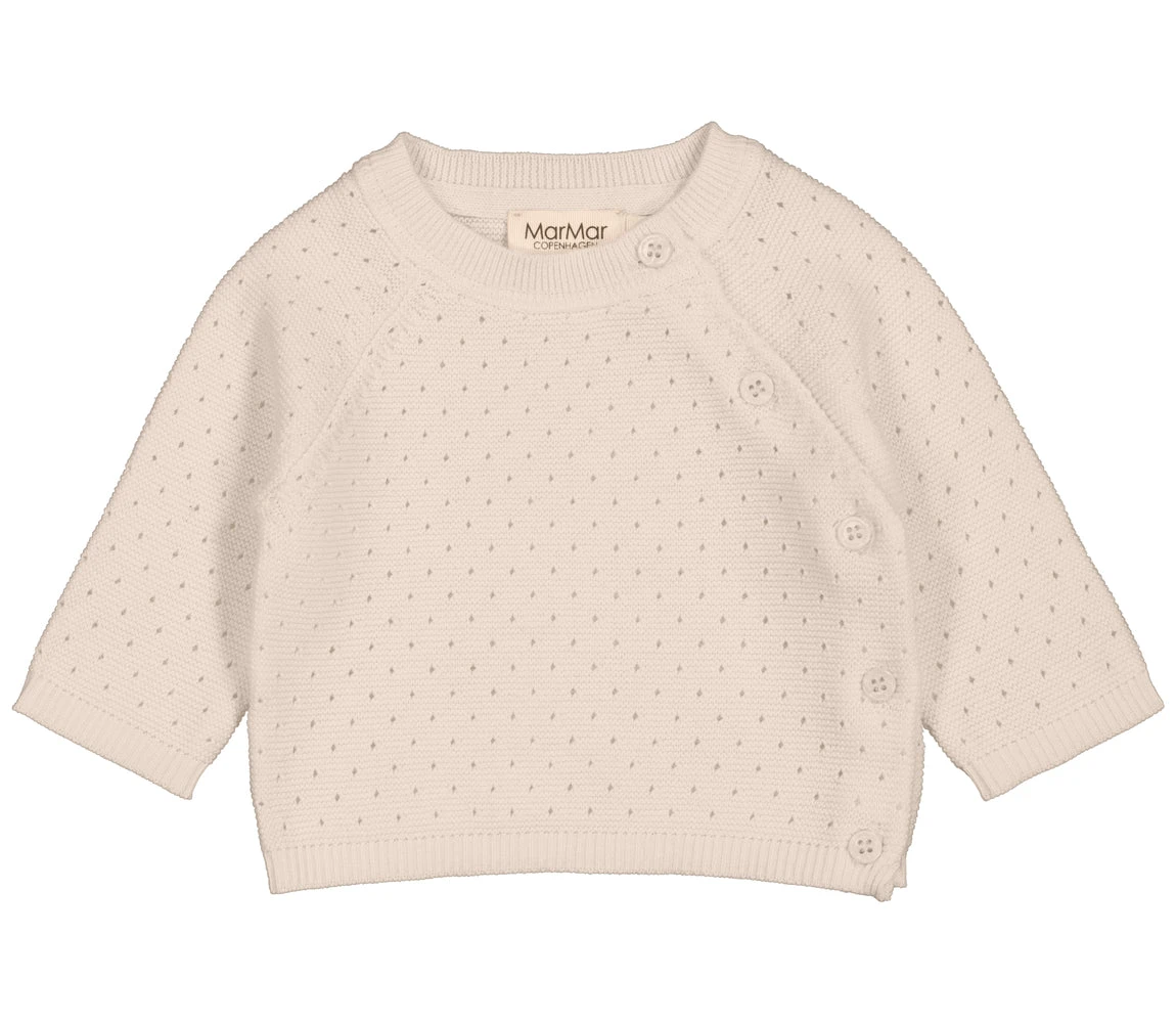 Knitted blouse with raglan sleeves and button closure on the left side. The knitted blouse has fine lace pattern details.