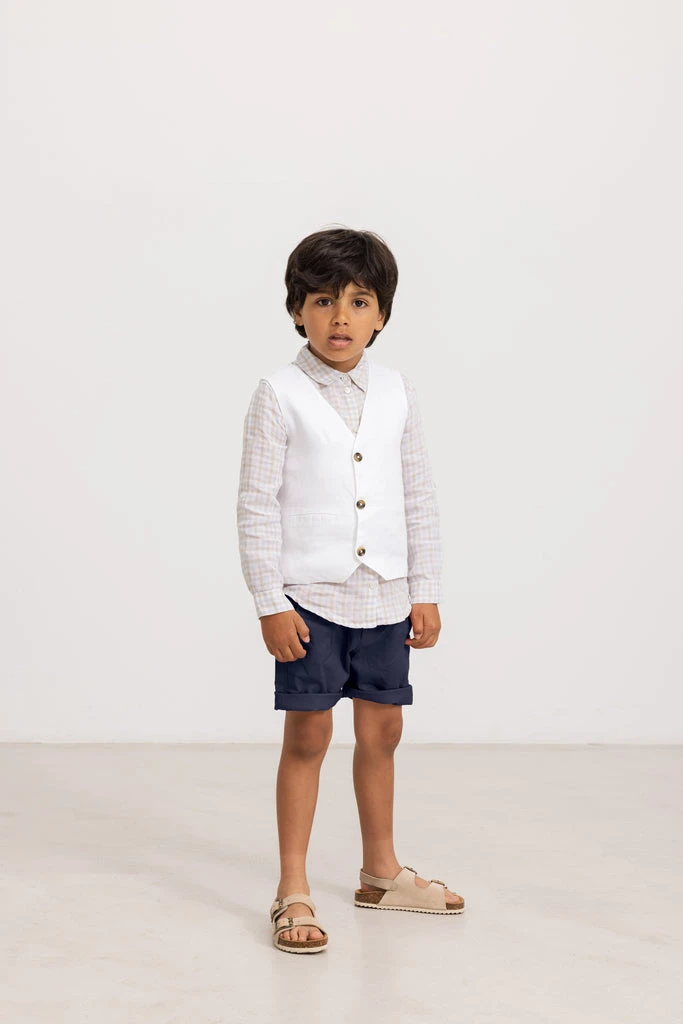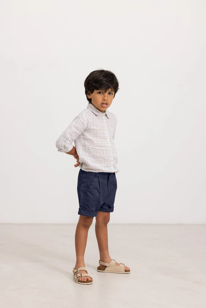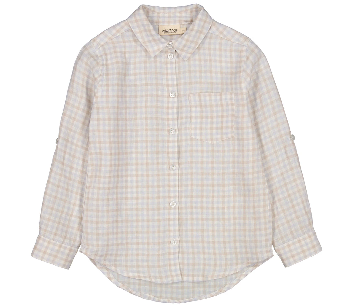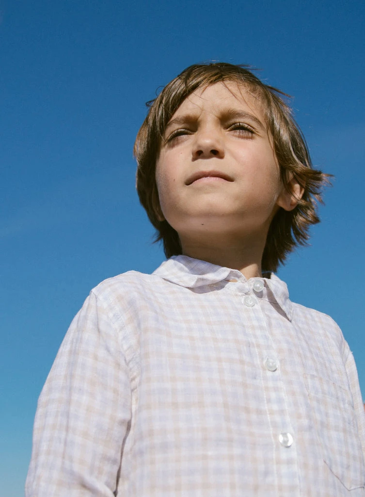 Classic linen shirt woven in a check pattern, with a front pocket and sleeves with button closure. The shirt is slightly longer at the back.