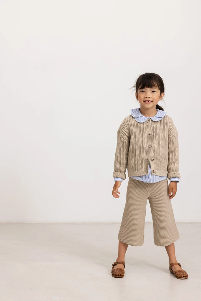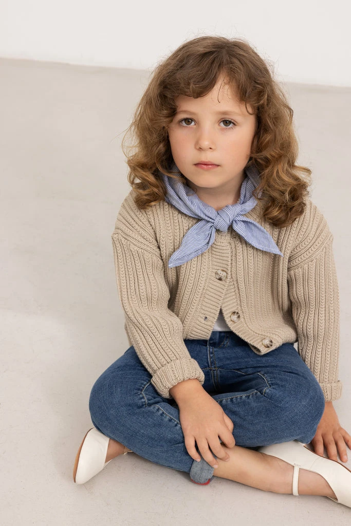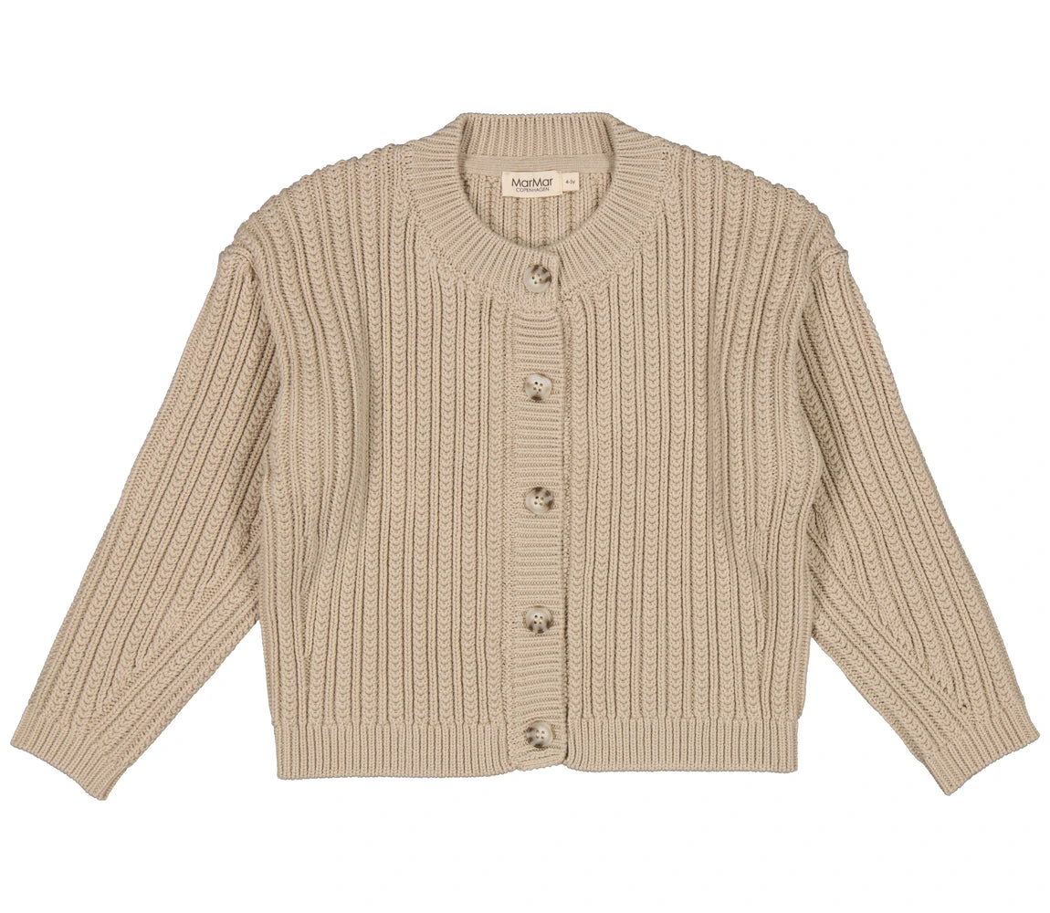 Knit cardigan with button closure at the front. The cardigan has fine cable knit details.