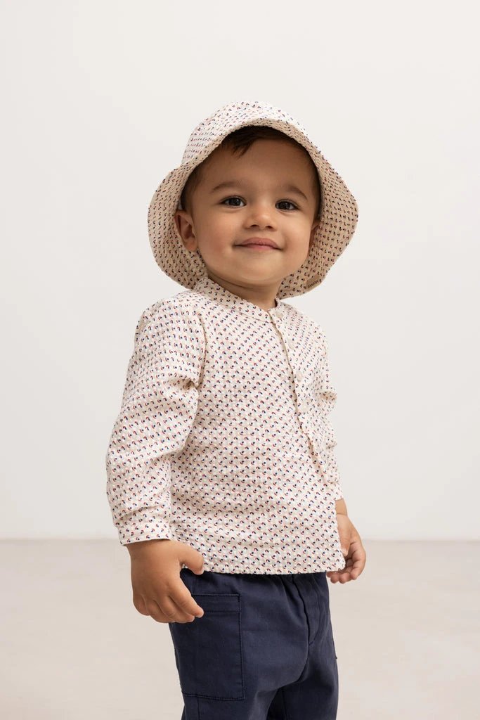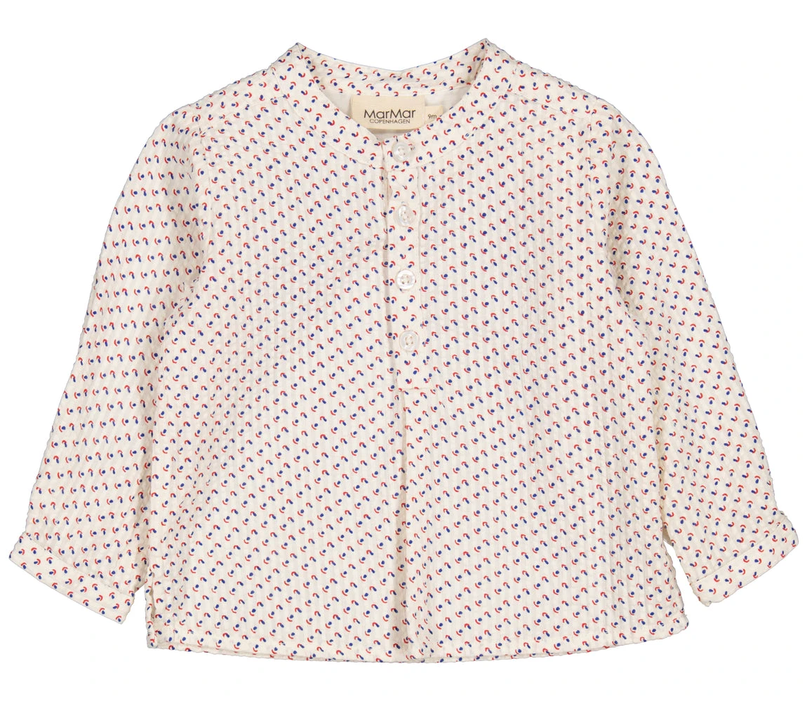Long-sleeved brook and wave shirt with a Chinese collar and button closure. The shirt has a comfortable fit