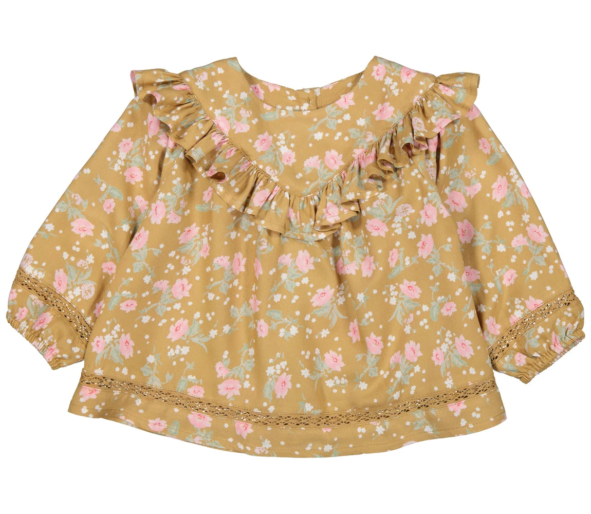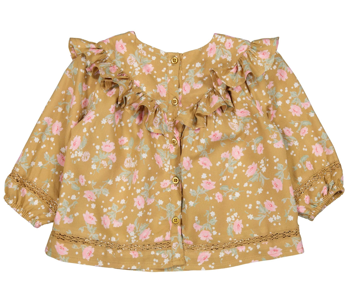 Loose-fitting, long-sleeved soft viscose blouse with a cute ruffle at the front and lace edge details. The blouse closes at the back with buttons.