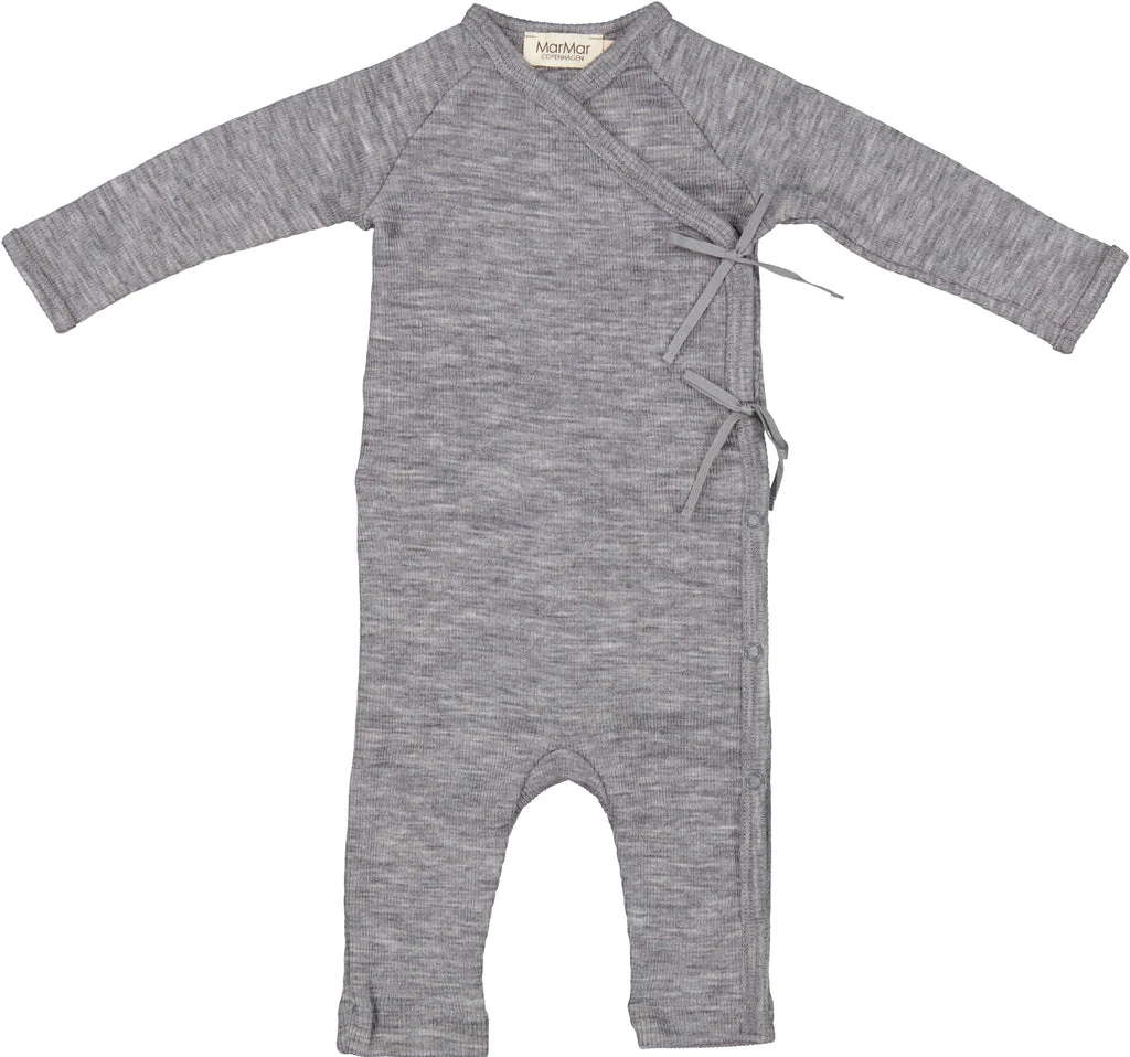 Long-sleeved jumpsuit for newborns. The jumpsuit has a wrap-around closure. Closes with snaps and ties.