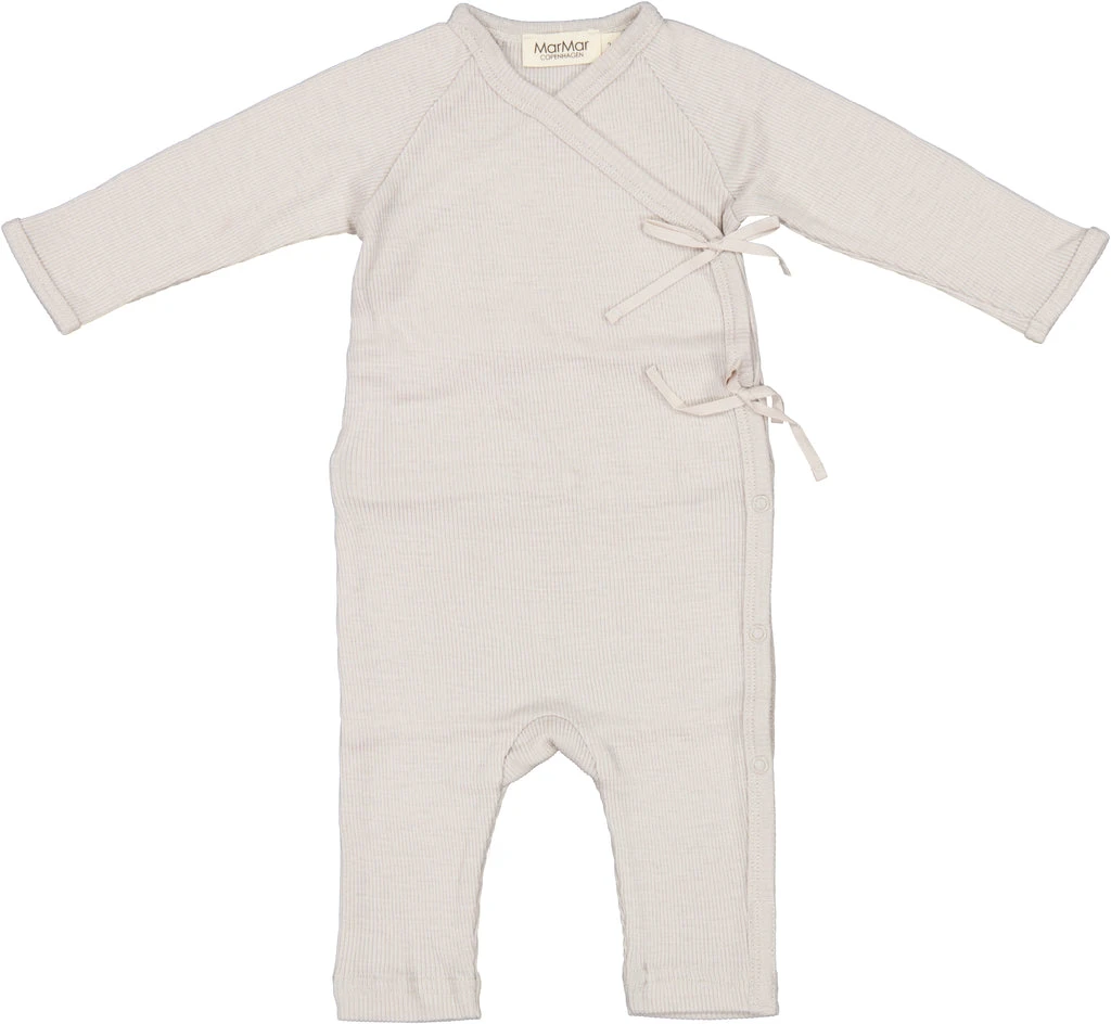 Long-sleeved jumpsuit for newborns. The jumpsuit has a wrap-around closure. Closes with snaps and ties.