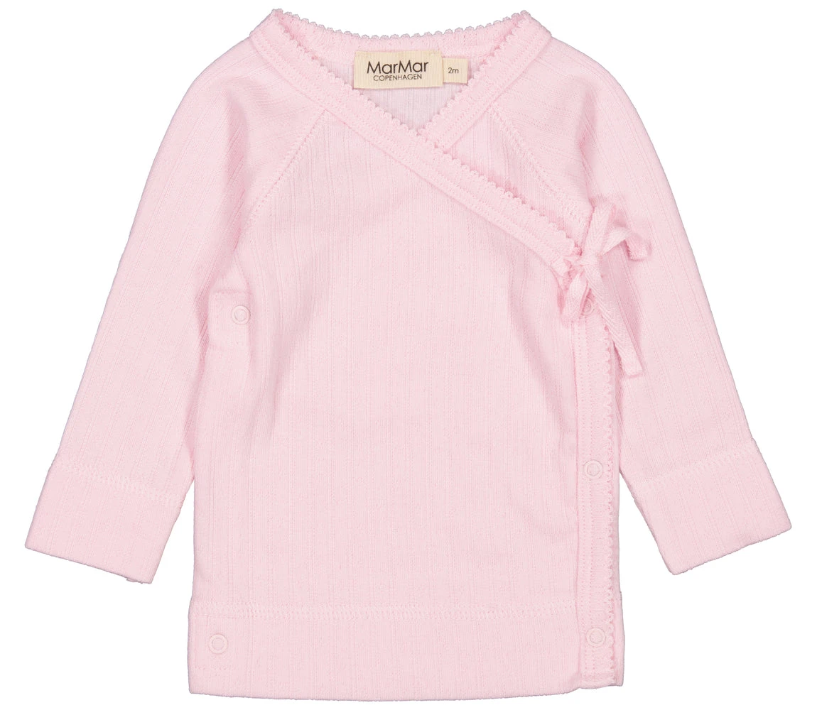 Long-sleeved pointelle blouse for newborns with wrap-around closure. The blouse closes with snaps and ties. The blouse is soft, stretchy and comfortable to wear.