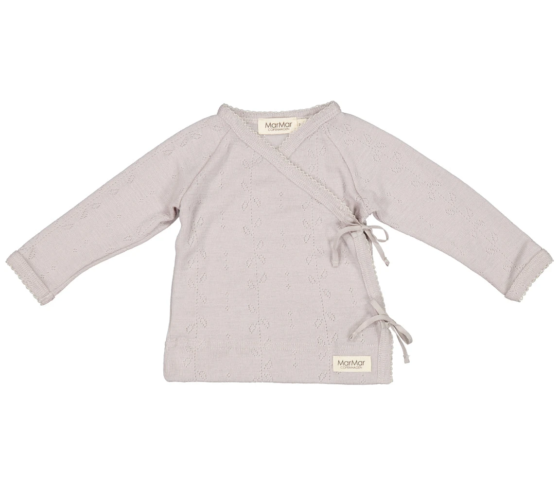 Long-sleeved blouse for newborns with wrap-around closure. Closes with snaps and ties.