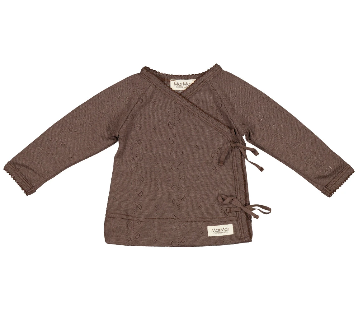 Long-sleeved blouse for newborns with wrap-around closure. Closes with snaps and ties.